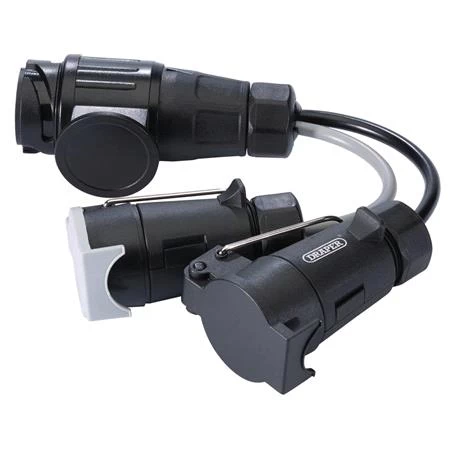 Converts 12V 13-pin Euro socket to 7-pin N-type and S-type. 130mm cable. Weatherproof sprung socket covers protect the connections when not in use and locks the 7-pin plugs when in use. Hanging loop fitted to one of the sockets for easy storage.