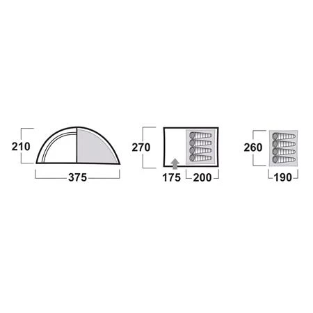 - Outer tent: 185T Polyester, 3 000 mm/cm2 PU coating, taped seams
