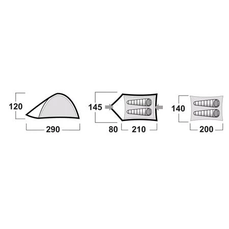 - Outer tent: 185T Polyester, 4 000 mm/cm2 PU coating, taped seams