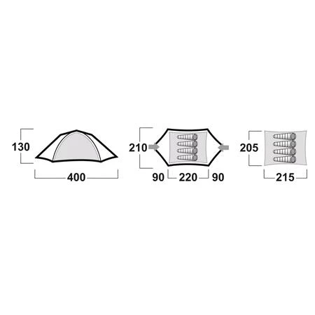 - Outer tent: 210T Polyester RipStop, 6 000 mm/cm2 PU coating, taped seams