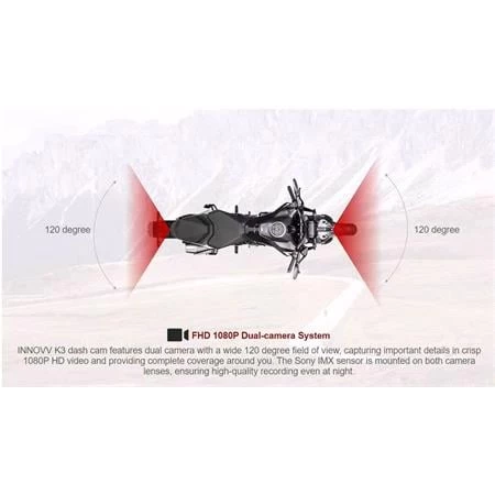 The INNOVV K3 dash cam features a dual camera with a wide 120 degree field of view, capturing important details in crisp 1080P HD video and providing complete coverage around you. The Sony IMX sensor is mounted on both camera lenses, ensuring high-quality recording even at night.