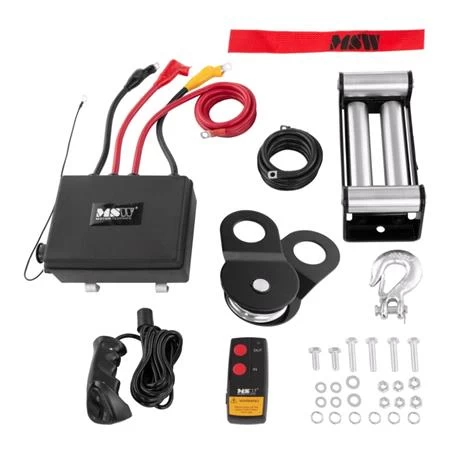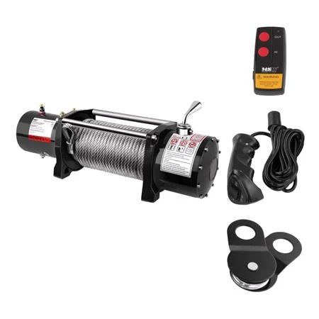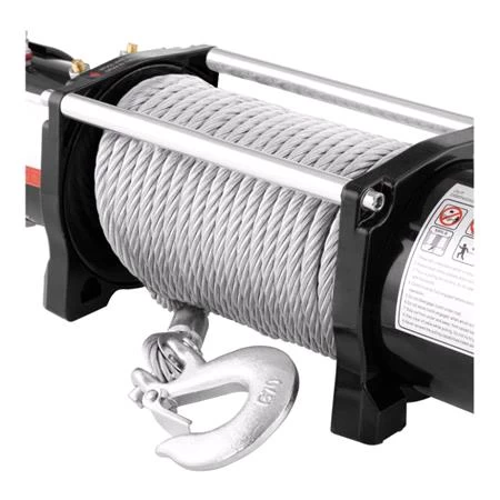 The 5.5 HP (4000 W) motor, along with a large drum and strong steel cable, achieves a pulling force of 9,500 lbs (4,310 kg). In addition, the DC design facilitates quick and easy retrieval of the vehicle from a ditch or other terrain obstacle.