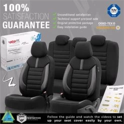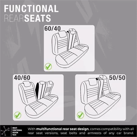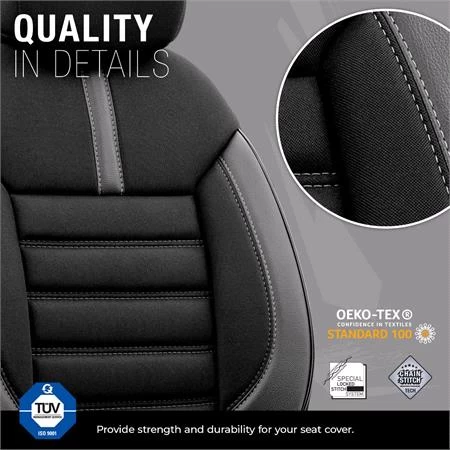 The covers have a certified AIRBAG seam as standard, making them suitable for cars with both side airbags in the seats and standard seats. Thanks to the special seam, they cover the seats completely without interfering with the AIRBAGs.