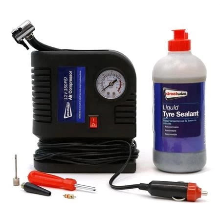 The tyre sealant is used to seal and repair the affected the area of your tyre, and the 150 PSI air compressor is used to inflate your tyres back to its recommended tyre pressure.